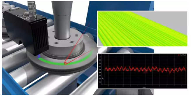 剎車片在線檢測(cè),Z方向檢測(cè)精度高達(dá)1.1μm。測(cè)量最大和最小高度,并計(jì)算出平均值,以確定可接受的表面光潔度。