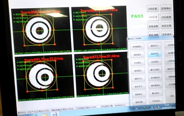 四元數(shù)針對上述問題研發(fā)了CCD半自動曝光機系統(tǒng)其原理:先通過相機居中功能使四個靶標位于中心位置,再通過對位平臺的運動來實現(xiàn)上下菲林和板中心對齊,四個相機分別對四個靶標進行識別監(jiān)控,確保對位精度。